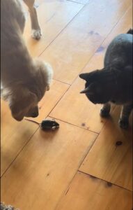 Seconds later, the family’s golden retriever trotted in, tail wagging. Surely the dog would save the day. But instead, he lowered his head, sniffed, then looked back at the cat as if to say: “So… what do we do now?”