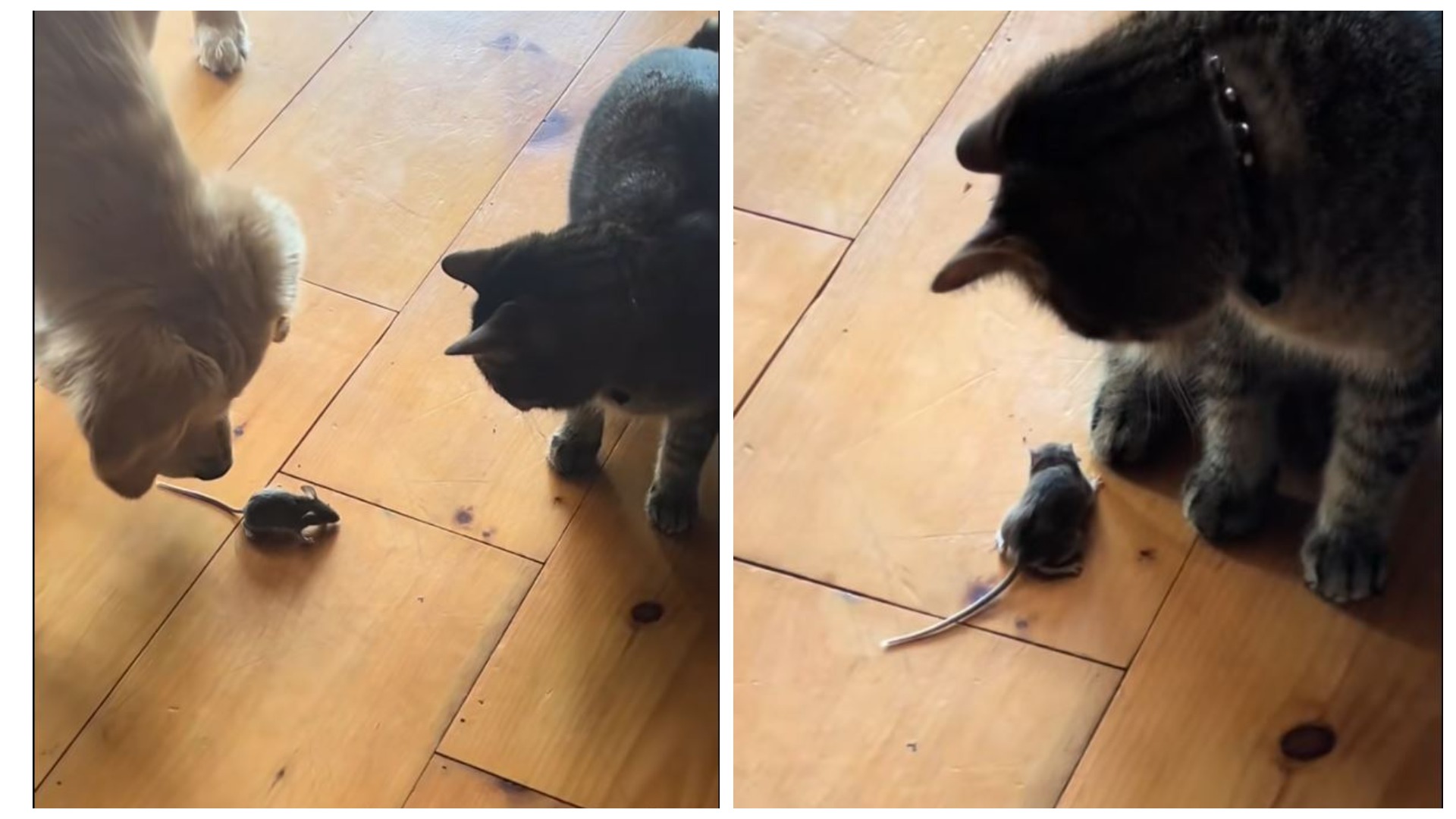 The funniest twist? The family actually owns not one, but two cats and a dog — and not a single one stepped up to the plate. The second cat eventually entered the scene, only to sit down and yawn. Meanwhile, the mouse boldly sniffed around like it was inspecting its new rental property.